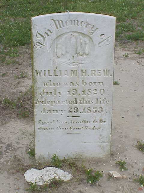 Columbus J. Rew Columbus J. Rew (footstone) (uncertain) Henrietta D. Rew Henrietta D. Rew (footstone) William H. Rew (1) William H. Rew (2) William H. Rew (footstone)