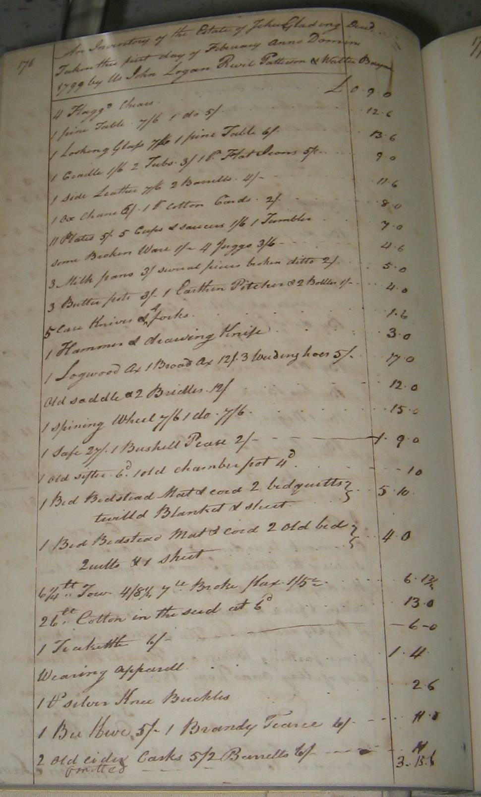 An Inventory of the Estate of Jehu Gladding Decd Taken the first day of February Anno Domini 1799 by Us John Logan Revil Patterson & Walter Bayne