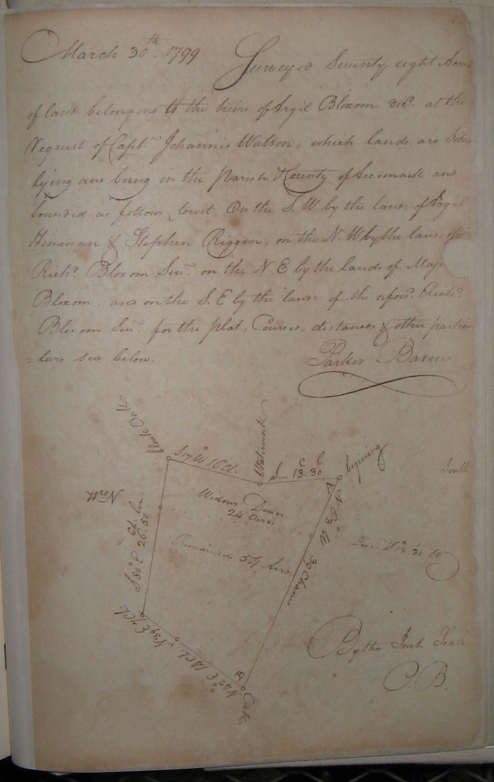 30 March 1799 Surveyed Seventy eight Acres of land belonging to the heirs of Argil Bloxom decd at the Request of Catp Johannis Watson, which lands are Situate lying and being in the Parish & County of Accomact and bounded as follows (towit) On the S. W. by the lands of Argil Hinman & Stephen Riggen, on the N. W. by the lands of Richd Bloxom Senr on the N. E. by the lands of Major Bloxom and on the S. E. by the lands of the aforsd Richd Bloxom Senr for the Plat, Courses, distances & other particulars see below Parker Barnes