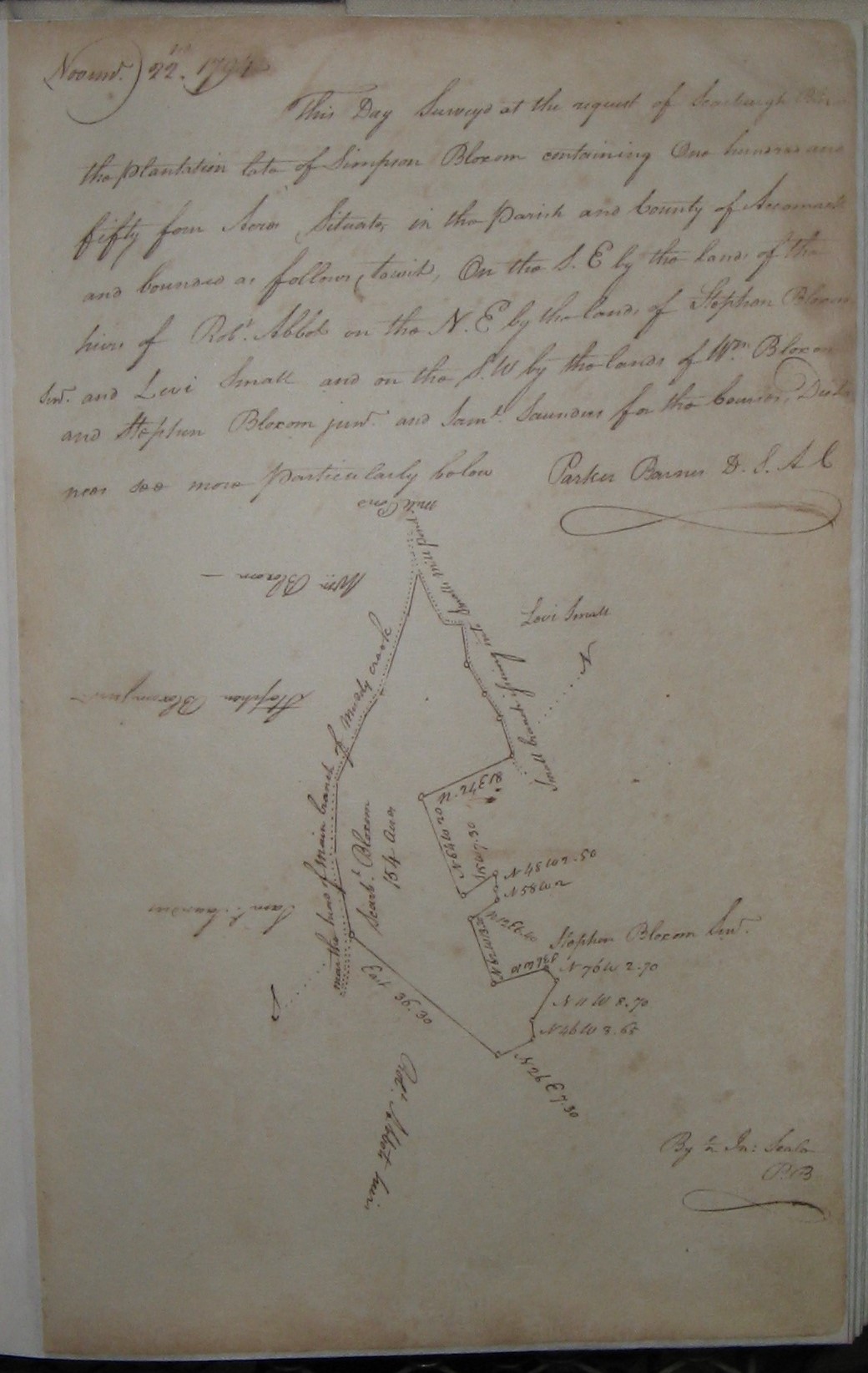 22 November 1794 This Day Surveyed at the request of Scarburgh Bloxom the plantation late of Simpson Bloxom containing One hundred fifty four Acres Situate in the Parish and County of Accomack and bounded as follows (towit) On the S. E. by the lands of the heirs of Robt Abbot on the N. E. by the lands of Stephen Bloxom Senr and Levi Small and on the S. W. by the lands of Stephen Bloxom and Stephen Bloxom Junr and Saml Saunders for the bounders, Distance near see nore particulars below Parker Barnes D. S. AC